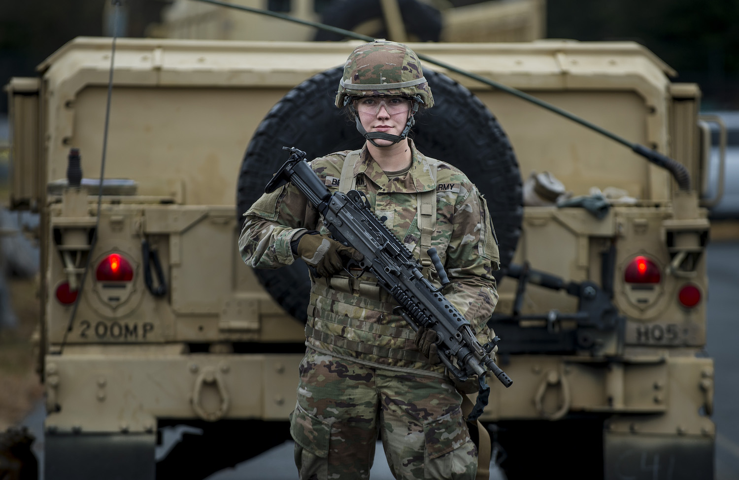Spc. Bethany Brennan, a U.S. Army Reserve logistics and supply Soldier from the 200th Military Police Command’s Headquarters Company poses for a portrait with an M249 Squad Automatic Weapon during a field training exercise at Fort Meade, Maryland, Jan. 8, 2019. The 200th MP Command provides trained and ready MP Soldiers, leaders and units-of-action to the Total Force in order to enable protection and promote the rule of law to win the nation’s wars. The command provides the full range of military police support to the Army’s decisive action in unified land operations whenever and wherever required. (U.S. Army Reserve photo by Master Sgt. Michel Sauret)